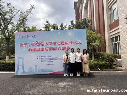 我校由临床医学院黄渟惠、刘诗蓉、钱欣等6名同学组成参赛队伍,与来自西南大学、重庆医科大学、西南政法大学等16所高校的17支队伍在决赛中展开角逐,最终荣获“重庆市第十五届大学生心理成长论坛”心理健康服务能力决赛一等奖。