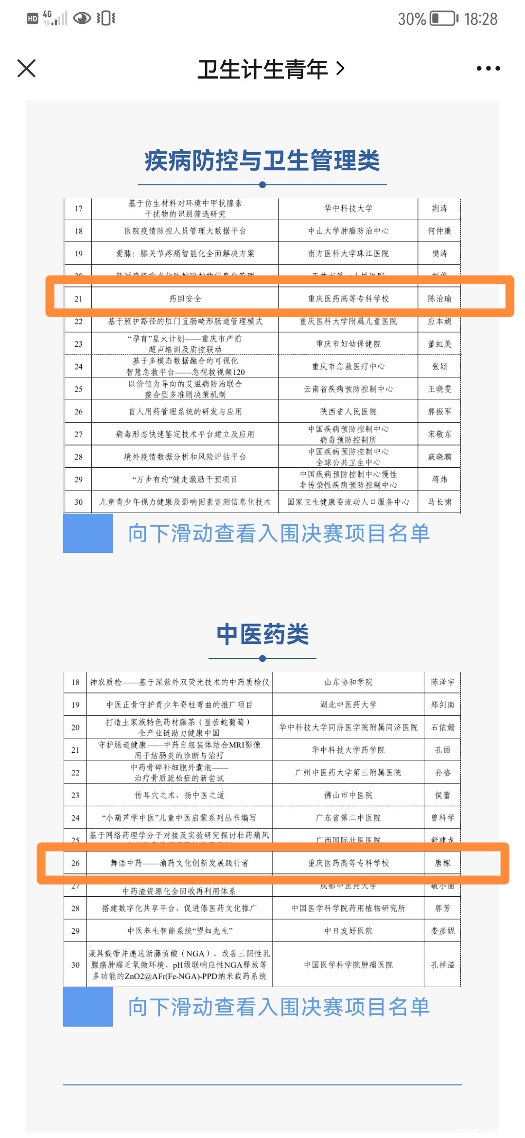 近日,由共青团中央青年发展部、国家卫生健康委文明办、中国青年创业就业基金会主办,国家卫生健康委直属机关团委、卫生健康青年创新中心承办的第八届“创青春”中国青年创新创业比赛卫生健康行业专项赛暨首届全国卫生健康行业青年创新大赛公布入围决赛名单。我校《药回安全》和《舞语中药——渝药文化创新发展践行者》两个项目分别入围“创青春”首届全国卫生健康行业青年创新大赛决赛疾病防控与卫生管理赛道、中医药赛道。