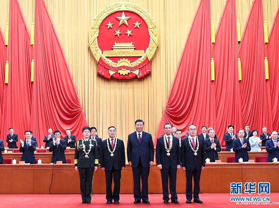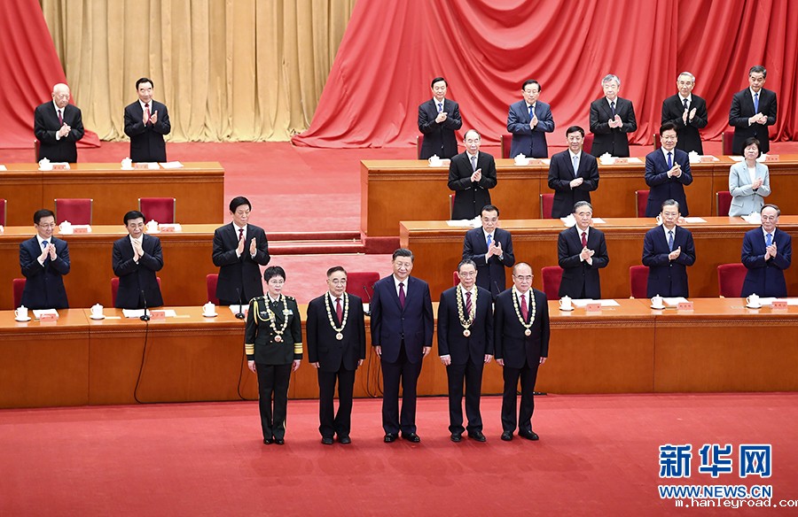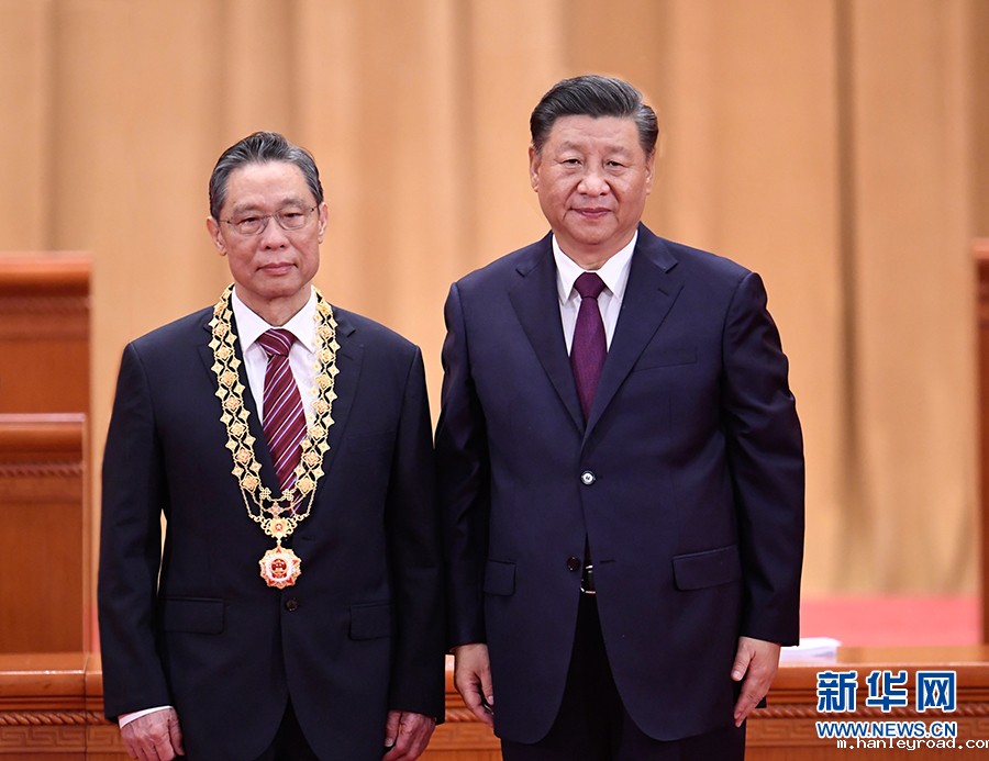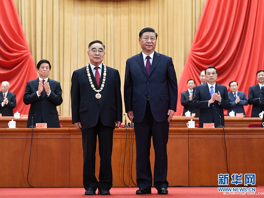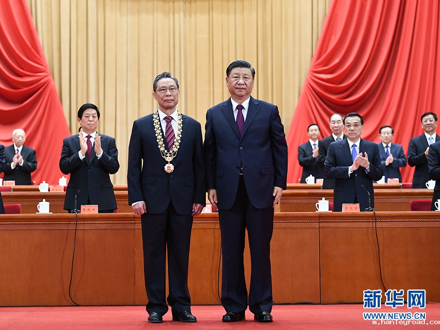栗战书宣读习近平签署的中华人民共和国主席令。主席令指出,为了隆重表彰在抗击新冠肺炎疫情斗争中作出杰出贡献的功勋模范人物,弘扬他们忠诚、担当、奉献的崇高品质,根据第十三届全国人民代表大会常务委员会第二十一次会议的决定,授予钟南山“共和国勋章”,授予张伯礼、张定宇、陈薇“人民英雄”国家荣誉称号。